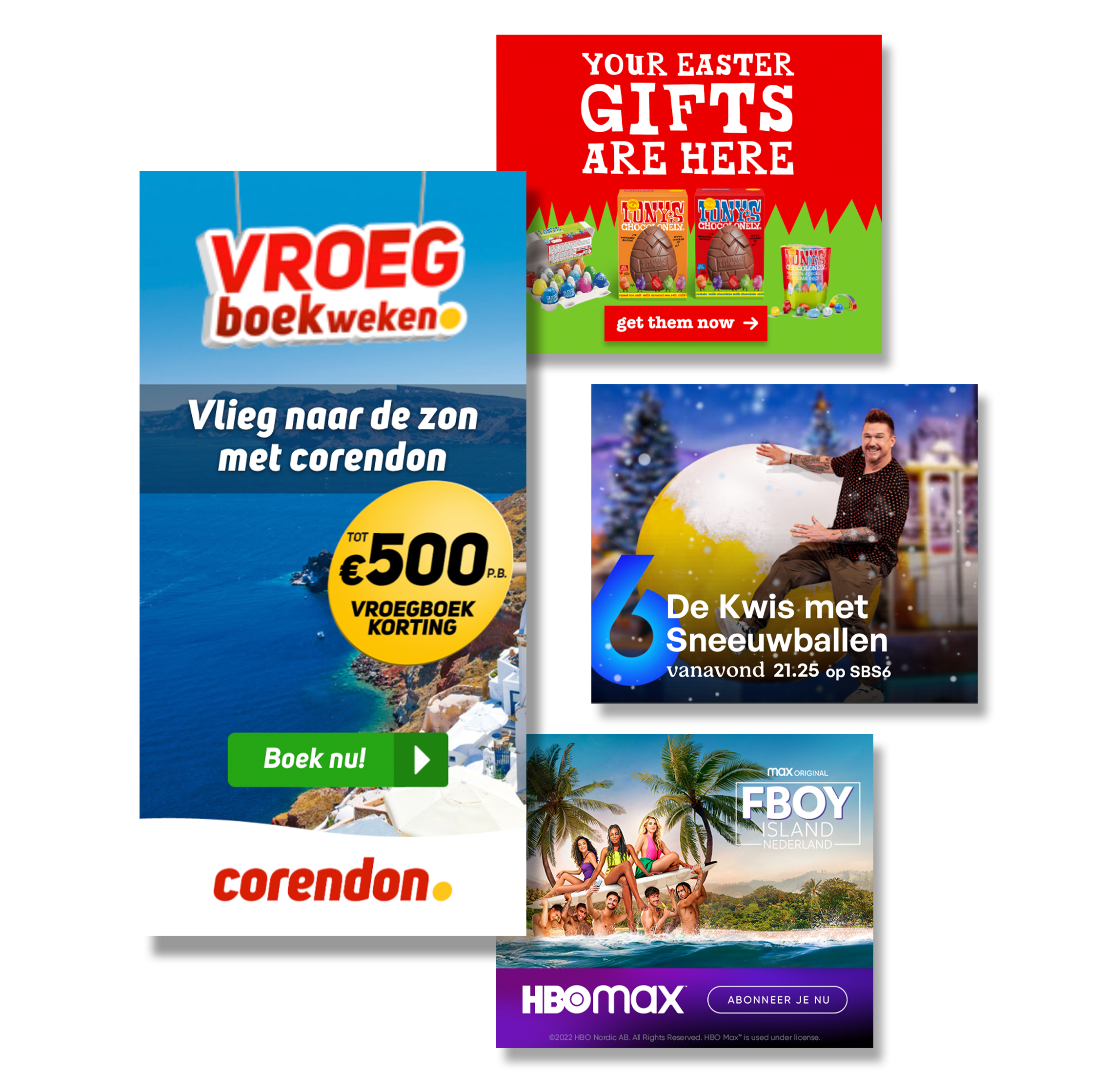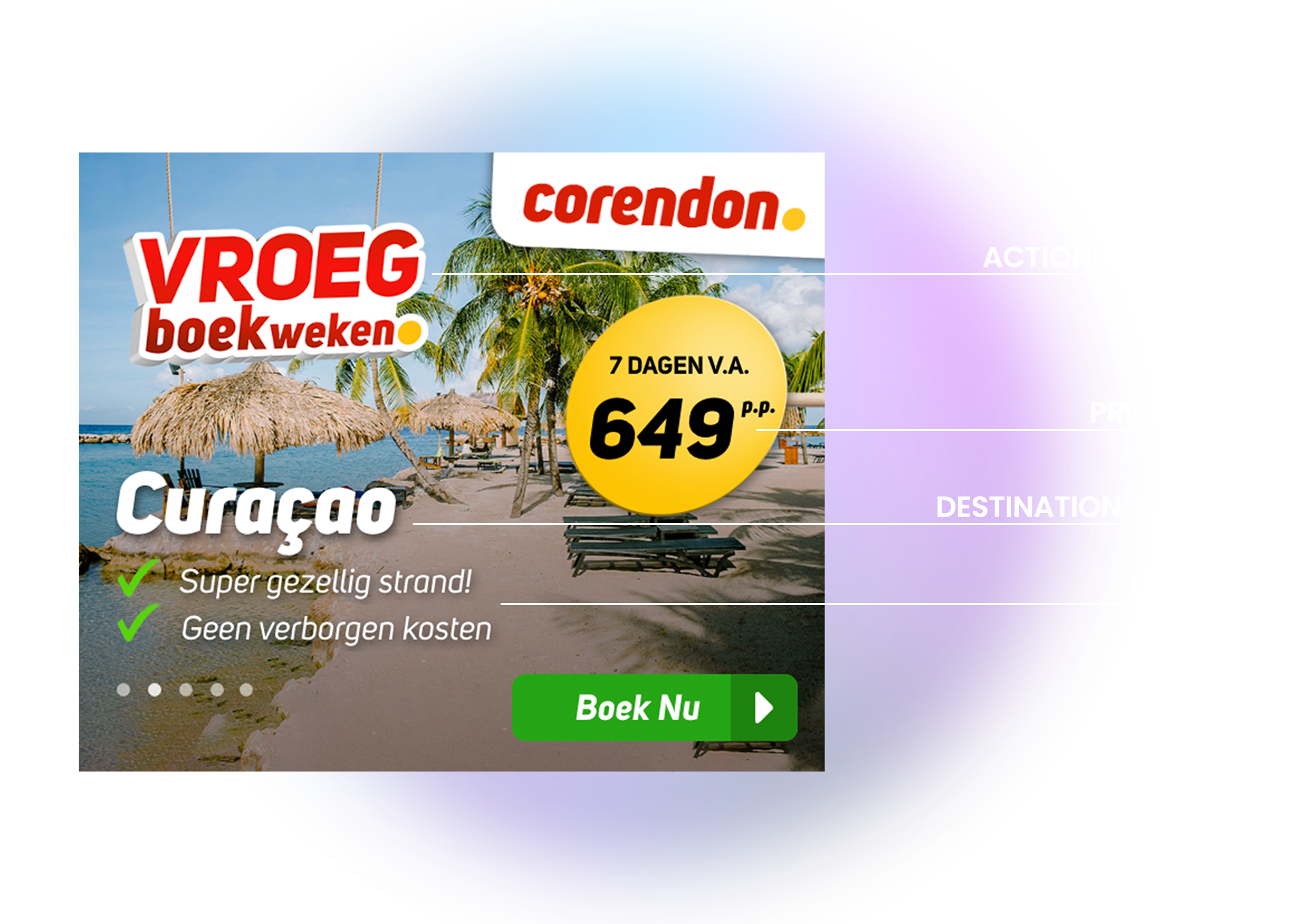 With hundreds of trips Corendon want to show relevant trips to the right people, we did this integrating their datafeed to our display creatives with the destination with the cheapest price and some usp’s and a unique actionsticker from their a relevant campaign.